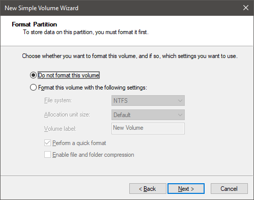 - Nella schermata seguente, selezioni "Non formattare questo volume" e clicchi su "Avanti".