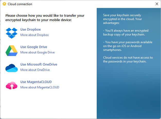 U kunt uw sleutelbos opslaan in een cloud-opslag om toegang te krijgen tot dezelfde sleutelbos vanaf meerdere apparaten (PC's, smartphones, tablets). U kunt uw sleutelbos ook op elk gekoppeld apparaat bewerken, bv. nieuwe vermeldingen toevoegen of vermeldingen wijzigen.