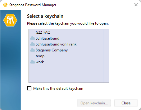Selecteer de sleutelhanger en klik op "Sleutelhanger openen...". De sleutelhanger wordt dan gedownload en het wachtwoord wordt gevraagd. Voer het wachtwoord in en klik op "OK" om de sleutelhanger te openen. U kunt de sleutelhanger dan op beide PC's gebruiken en bewerken. Wijzigingen in de sleutelhanger worden automatisch gesynchroniseerd tussen beide apparaten, zolang cloud synchronisatie is ingesteld.