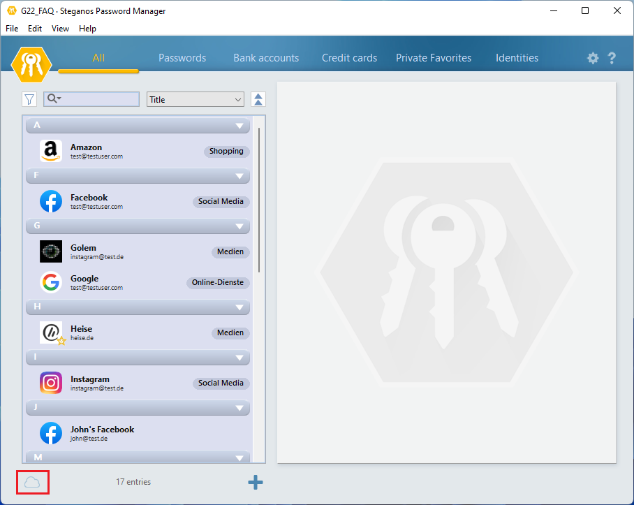 Om cloud synchronisatie in te stellen, klikt u op het cloud-icoon in de Steganos Password Manager.
