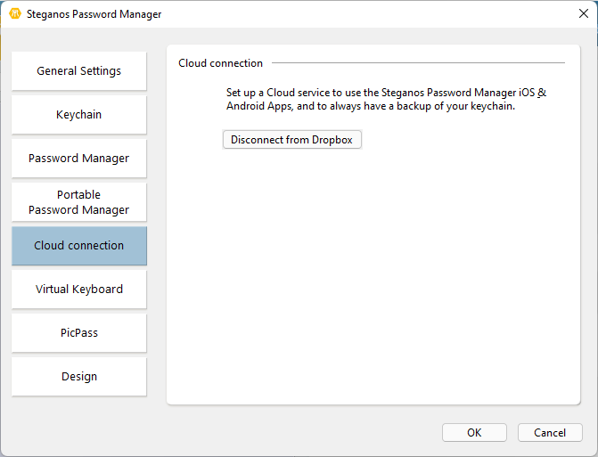 Om de cloudsynchronisatie uit te schakelen, opent u de instellingen van Steganos Password Manager (klik op het tandwiel in de rechterbovenhoek), kies dan de categorie "Cloudverbinding" en klik op "Cloudverbinding verbreken".