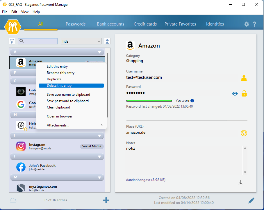 Aby usunąć niepotrzebny już wpis, wystarczy kliknąć prawym przyciskiem myszy na wpis na liście wpisów i wybrać "Usuń ten wpis". Alternatywnie można zaznaczyć wpis na liście, a następnie wybrać z paska menu "Edycja" -> "Usuń".