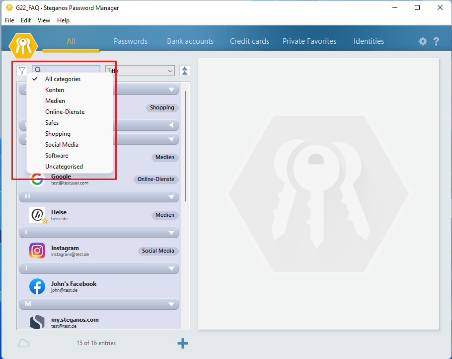 O filtro de categoria pode ser activado clicando no ícone do filtro no canto superior esquerdo e seleccionando uma das categorias.